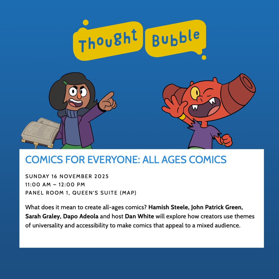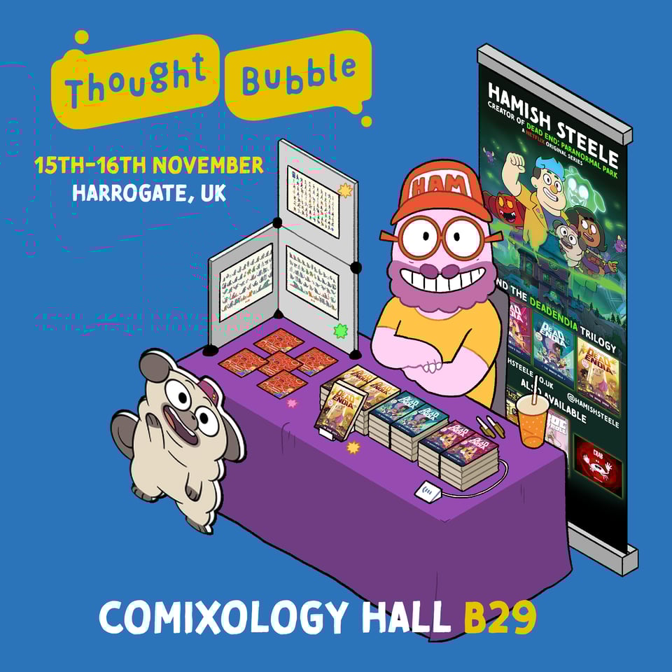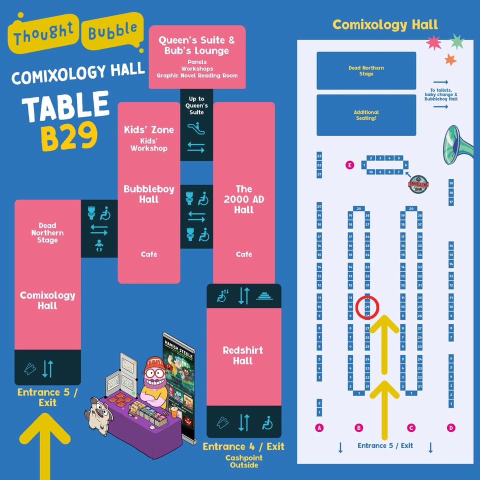 This upcoming weekend, I’ll be at Thought Bubble in Harrogate. Come find me in the Comixology Hall at Table B29. I should be very easy to find actually, as if you enter through Entrance 5 (the one on the left if you’re facing the convention), I’m in the middle aisle and close to the entrace.