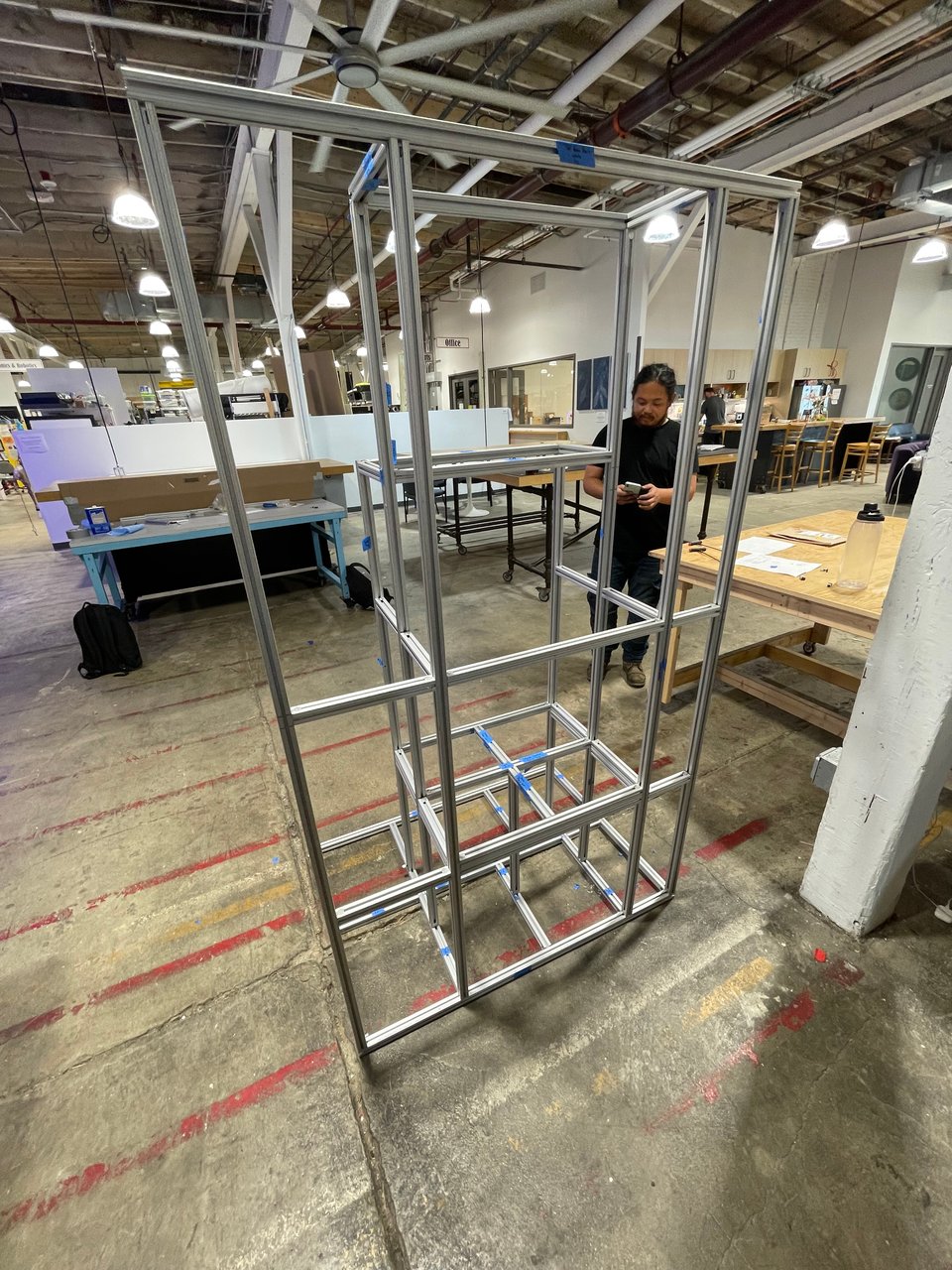 There were no particular constraints on system footprint for the MWLC challenge, so el Titan v1 was mounted onto two wooden pallets. For the PUC Contest, pressure vessels would be mounted vertically to save space and facilitate installation of the bladder. The frame for el Titan v2 would be constructed anew and was made from aluminum extrusion (80/20) at the machine and metal shops in Artisans Asylum (Allston, MA). Time in Yuma would be limited, so Alondra and Quantum practiced assembly of the frame several times at Artisans before shipping the disassembled (but carefully labeled) frame out to Arizona ahead of their flight.