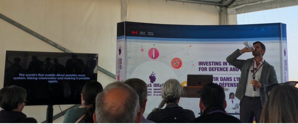 Aarya gave the presentation for Circular City, opening with a graphic from 2001: A Space Odyssey. He quickly worked up to the big reveal, holding up a bottle of pristine water: recycled wastewater from our site. He drank a couple big gulps in front of the audience. Of course, lab results from Southern Alberta Institute of Technology (SAIT) had confirmed that the water's heavy metals levels adhered to California direct potable reuse standards. Aarya invited the visitors to see our system and to drink the water for themselves.