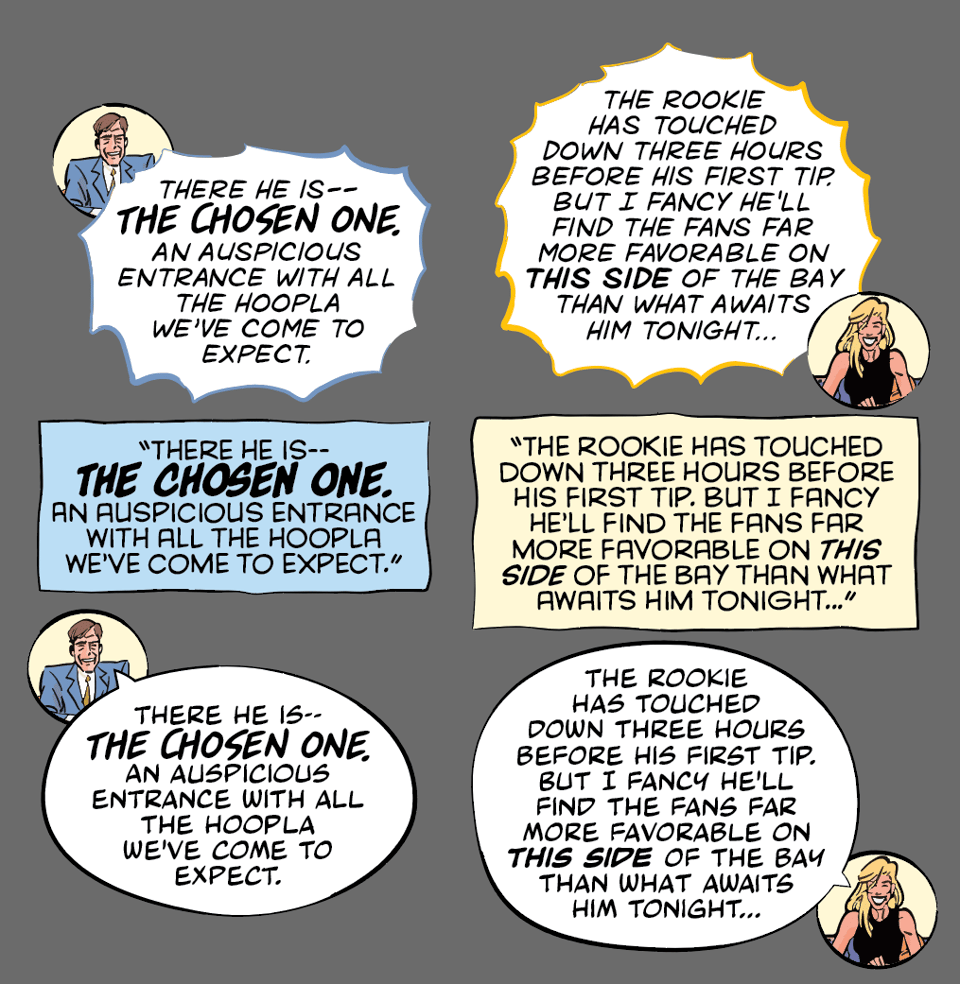 The other style choice was figuring out how to do the overlaid narration. It’s a comic that has a few different types of overlaid narration, between an authorial voice narrator and then a handful of pundits who run some of the story through news and TV “talking head” style snippets. The traditional way was through captions, but there’s something about having duelling caption types that I didn’t want to do too much, and the TV pundits were so instrumental to the process (and so recognisable for sports fans, too) that I felt like they needed a little something extra. And I’m a big fan of the little manga (and elsewhere) trick of having a little head pop-in to deliver some dialogue, so one of the options I offered up was the characters speaking next to a balloon.