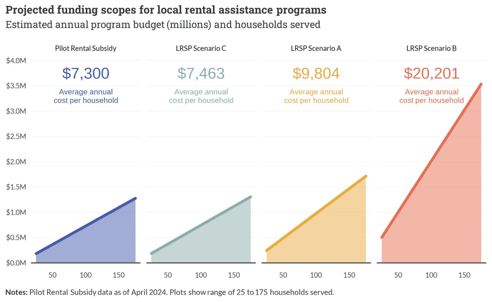 Our analysis revealed the tension between reach and impact. Two scenarios began with the same hypothetical $500,000 annual budget, but tested alternative subsidy approaches and prioritized different types of very-low income households. The third scenario explored what it would take to meaningfully support 150 persons or families in unstable housing situations. Here, the average subsidy per client more than doubled, leading to an estimated annual program budget in excess of $3 million.