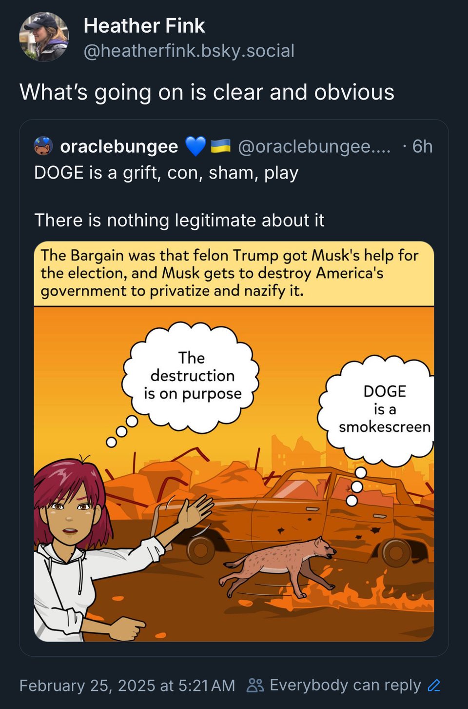 It's wild how clear it is to most people that Elon Musk hacked the election for Donald Trump, which keeps him out of jail, and that's why Musk can do whatever he wants. We all know that while Elon is the designer of his fascist schemes, he's not the brains behind his own operations. That means his DOGE boys likely did the actual vote hacking. And these 20 something boys are young and easy to manipulate. They are extremely vulnerable to spies - sexy spies, friend spies, whatever works - I hope we send our best and brightest to do the job.