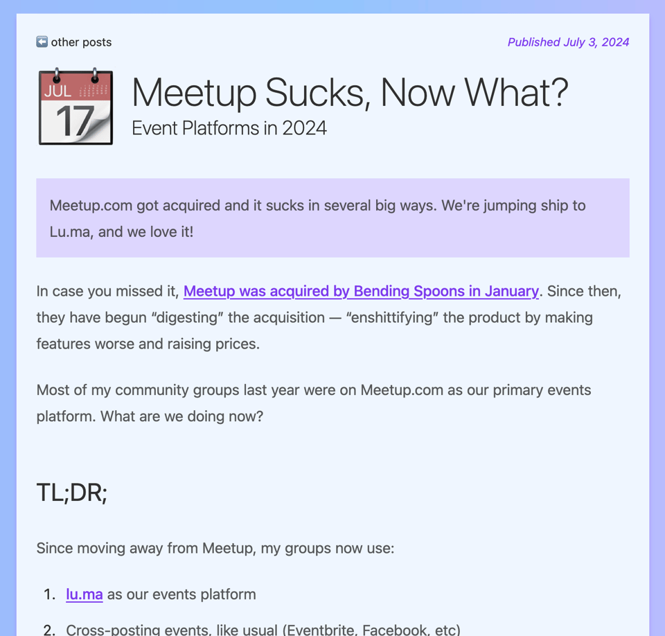 Meetup.com got acquired and it sucks in several big ways. We're jumping ship to Lu.ma, and we love it!
