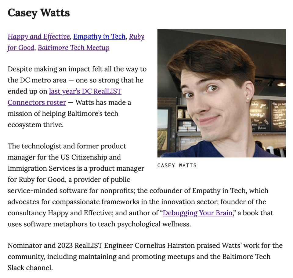 Iβm so proud of our community groups! I was nominated for the work I do with BaltimoreTechSlack.com and supporting local meetup groups (and organizers).
