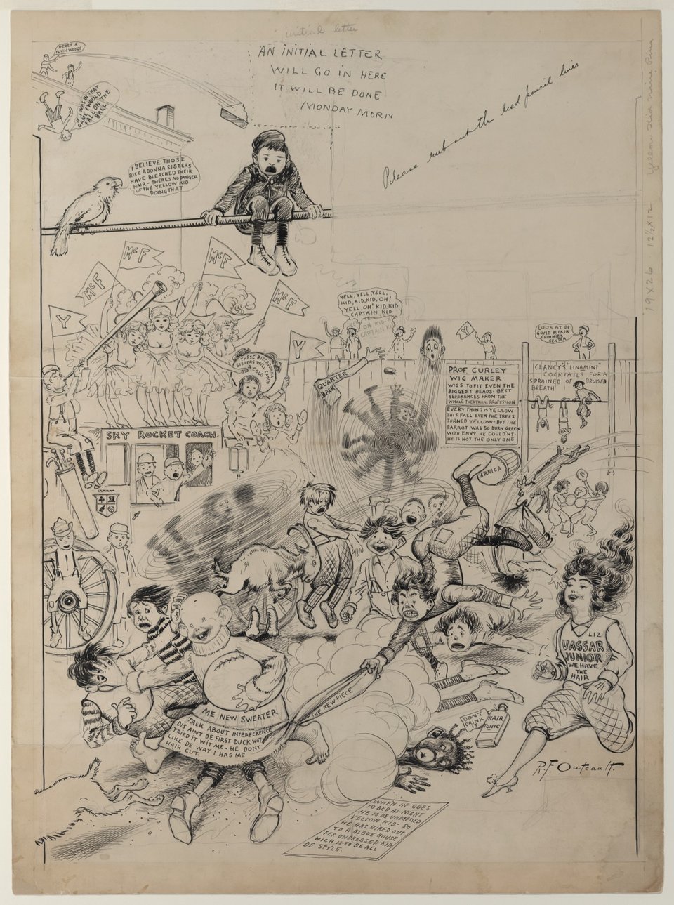 We can walk back a step in our study, because the mostly inked draft drawing of that comic is in the possession of the Library of Congress. Outcault clearly redrew it entirely. Note the four dancers (the Ricadonna sisters, who he had introduced not long before), who appear in a cartoony style sporting décolletage in the drawing, but in the final reproduction are depicted almost photo-realistically and covered up (but raising their skirts). This drawing omits the “Walter Camp Coach” joke and includes the Yellow Kid’s “girl,” Liz, at far right, where she is wearing a top that reads “Vassar Junior.” Yale and Princeton were men-only schools; Vassar, women-only.