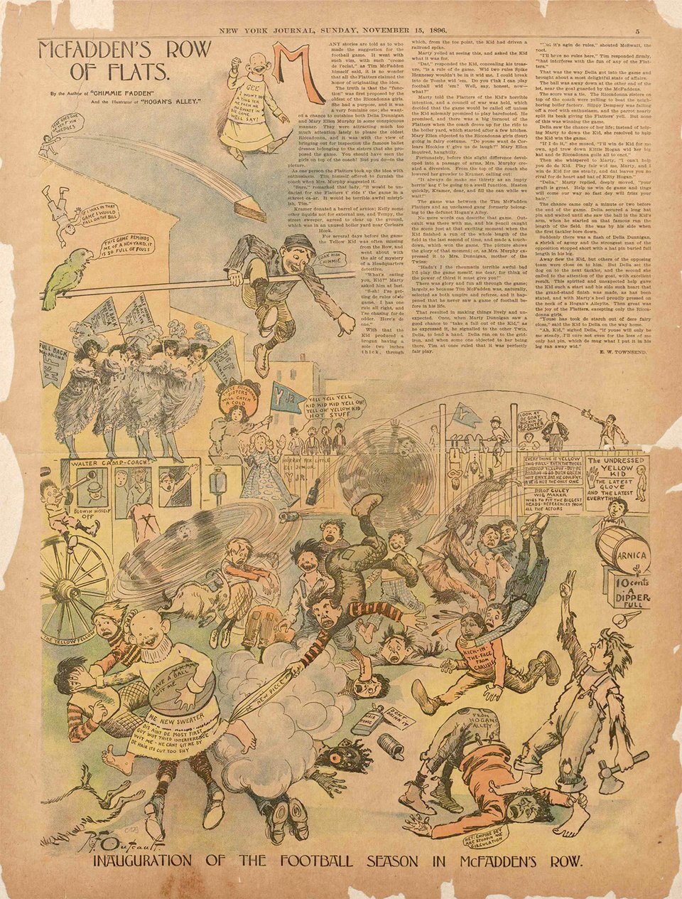The BICLM plate matches the full-page cartoon that ran on 15 November 1896 in the Journal’s eight-page comics supplement, which was printed in black, blue, and yellow for more important pages (the cover, the center spread of page 4 and 5, and the back cover) and in black and yellow on the others (pages 2, 3, 6, and 7). The “McFadden’s Row” comic appears on page 5.