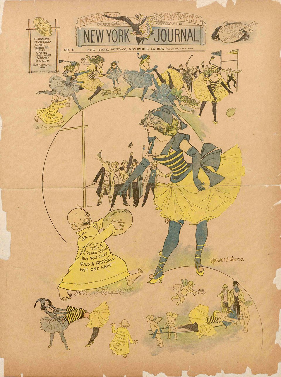 The cover also depicts a football game, this one played by artist Archie Gunn’s slightly risqué ladies, who appear in their typical tight tapered tops, skirts, and stockings. Outcault supplies his Yellow Kid in several places. Outcault and Gunn, being the two most-popular artists at the Journal, often drew their work side by side on covers and in promotions. The cover shows a Yale (blue) and Princeton (yellow) banner. While Yale’s school colors are blue, Princeton’s are orange and black—and you can’t make orange by mixing the yellow, blue, and black with which the page was printed.