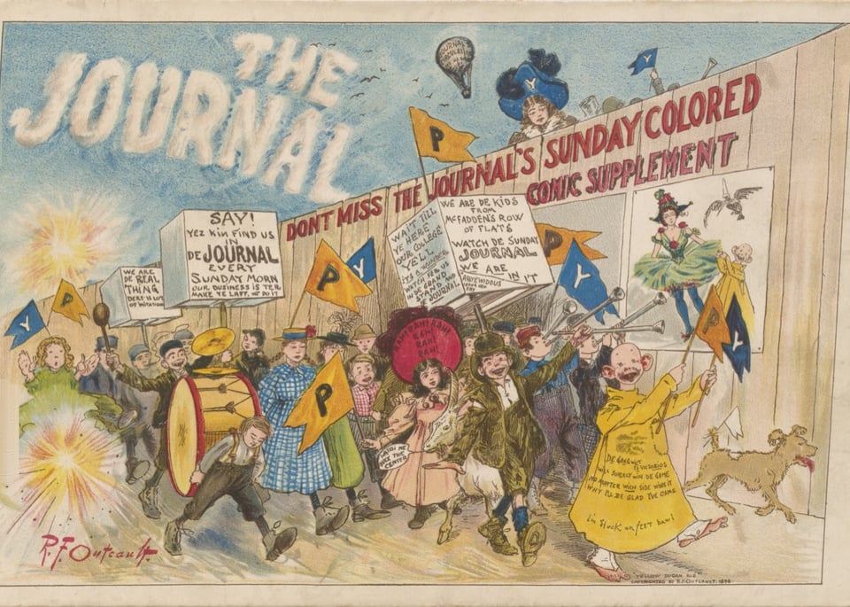 The Yellow Kid was an invention of Richard F. Outcault, an American newspaper cartoonist, whose work was among the earliest regularly appearing illustrations of the sort that resemble what we think of as comics today. Outcault created his shaved-head ragamuffin—shaved due to lice—in an oversized yellow shirt for a magazine in 1894. The character then appeared in cartoons for Joseph Pulitzer’s New York World in 1895 as part of the slice-of-life comic “Hogan’s Alley," depicting children in the Irish slums of Manhattan.
