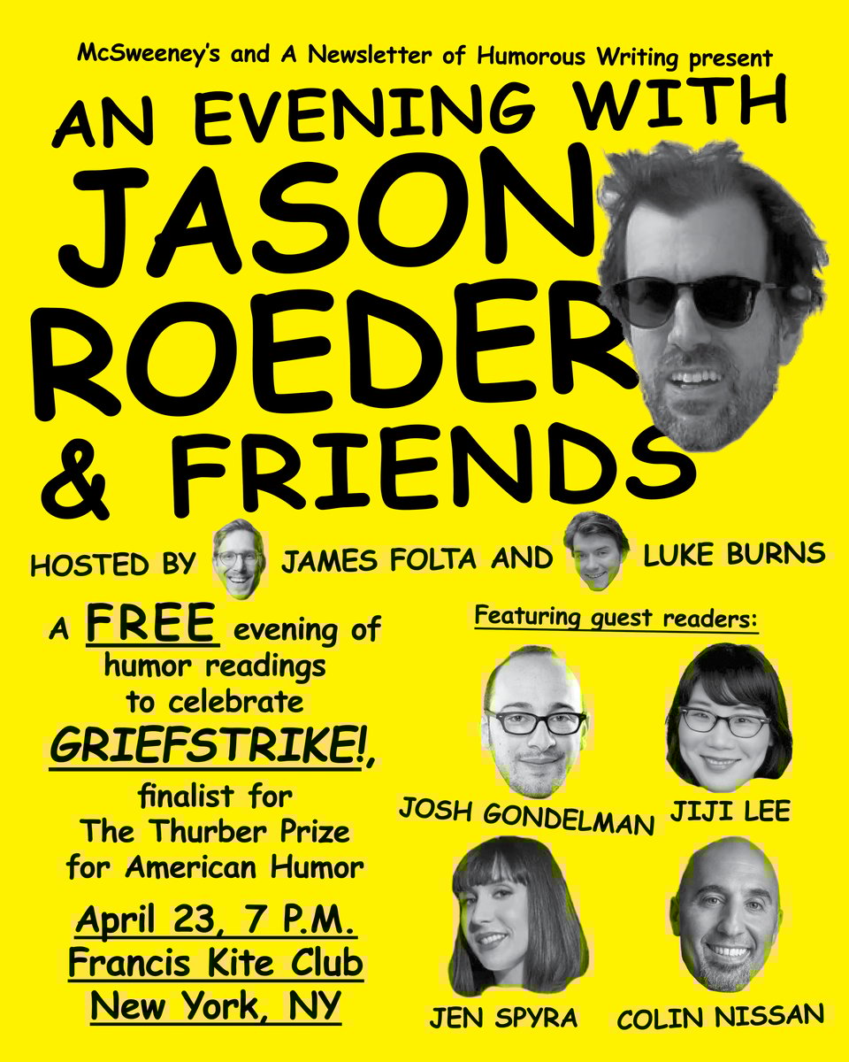 Hello and welcome to A Newsletter of Humorous Writing, a roundup of the week's finest short humor pieces and funny articles, and a celebration of the fantastic writers who wrote them. A reminder: Luke and James are hosting a show with McSweeney’s to celebrate Jason’s Roeder’s book Griefstrike!, which is a finalist for the Thurber Prize for American Humor!
