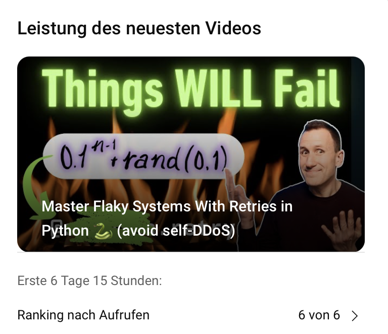 While the market for introductory videos is infinitely bigger, there is a genuine hunger for advanced content by people who know what they’re talking about. I know I had a hard time finding it, which was also a reason to start1. I was profoundly disgusted by charlatans and opportunists raking in 10s of thousands of views with overproduced videos teaching how to import a Python module while clearly never having written a line of production code in their life. I won't be able to ever compete with them, but I'm trying to offer an alternative.