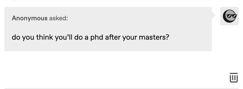 answer: hi there! I also had a few questions about how to decide if a master’s is for you, so why not talk about it here too. How does one decide if a master’s or a phd or “a big next step” is the right decision? I decided to do my master’s because it aligns with my career goals but also because it’s a chance for me to grow as a person. I wanted growth, so I moved far away from home in a country I don’t speak the language in. I saw it as an exercise of exposure and a chance for learning in newness. Maybe I will do a phd, I can’t say for sure now but if in a few years I feel like it will be a good environment for growth then that maybe might become a yes. I think of myself as a plant. I need soil, fertilizer, sun, rain - biodiversity. If my gut instinct, paired with an actual reasoning process, tells me the “big next step” is not biodiverse enough I then create an atmosphere for growth where I am. It all depends on your vision, where do you want to go? Postgraduate education is like taking a train somewhere, where you get off depends on your destination.