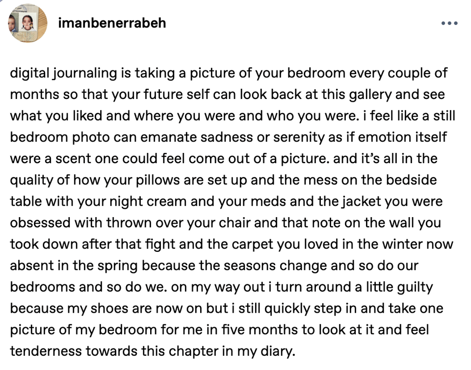 Love it. Your bedroom documentary photography especially resonates. It's not my first exposure to the idea, but you are making me want to act on it. I first saw a series by a photographer that was just photos of every single bed (or other surface) she ever slept on. It was incredible. I can't remember what her name is, unfortunately. I also knew someone who would take a close-up photo of the fabric texture of every lamp within hotels he'd stay at, very specifically. I also love newsletters. I find it impressive that you don't have Instagram. All my IRL communities share their events and new works there, so I still feel tethered to it. I have a photography website, though ( https://fensphotos.wordpress.com )! I'm still figuring out what "stories" I want to tell with photography. Anyways, love this idea! You have a refreshing energy that helps make the digital world feel healthy to engage with. I have the "Unhook" browser extension on for YouTube that limits me to subscriptions only, and your channel is one that I've included! Looking forward to the next~