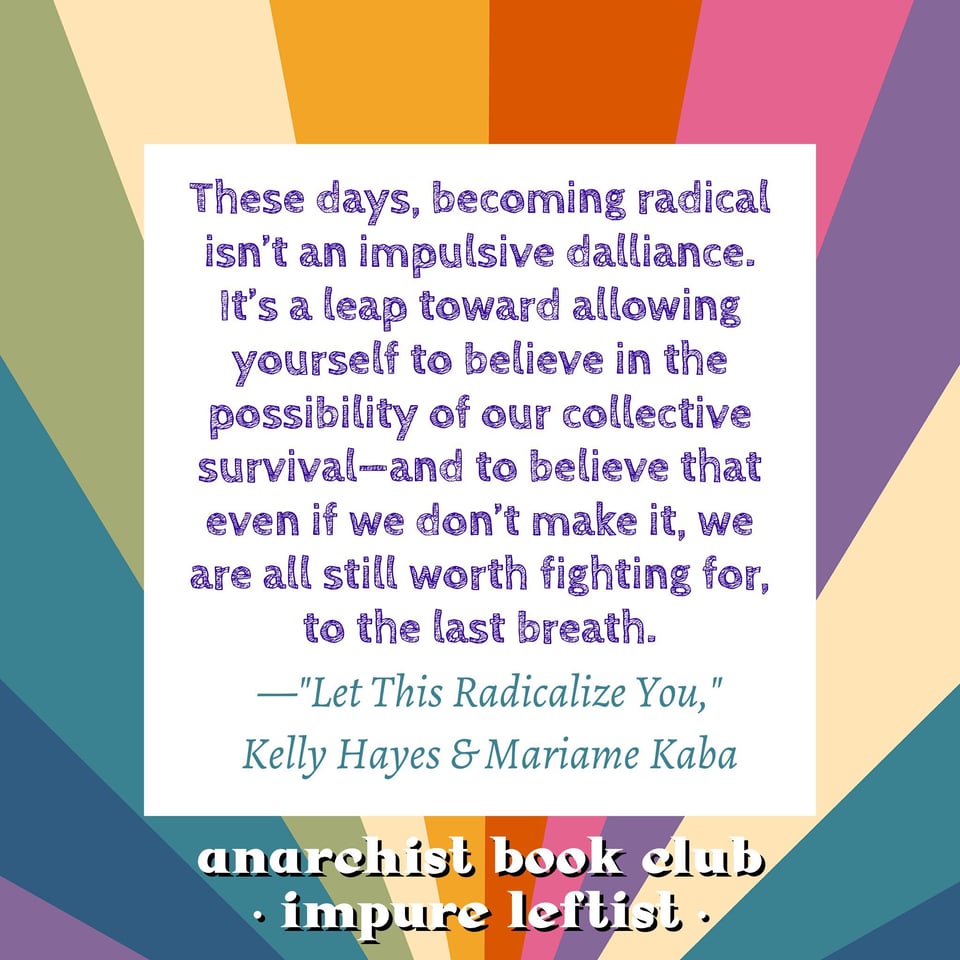 The title of this month's book club pick comes from co-author Mariame Kaba's quote, "Let this radicalize you, rather than lead you to despair." The first few chapters frequently reference how despair is used by capitalist systems to demoralize and desensitize us, keeping us focused on our own tiny spheres instead of our roles in larger networks of community and interdependence: