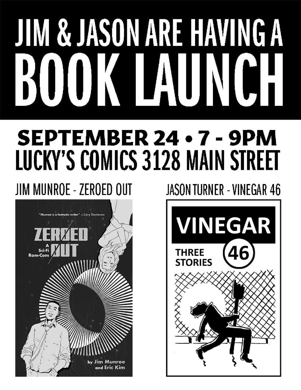 :: message. Set your clocks, boys and girls! On September 24th, Jim Munroe and Jason Turner will be in Vancouver at Lucky’s Comics over at 3128 Main Street! They’re having a book launch and they’ll be selling copies of Zeroed Out and Vinegar 46. Be sure to check them out!