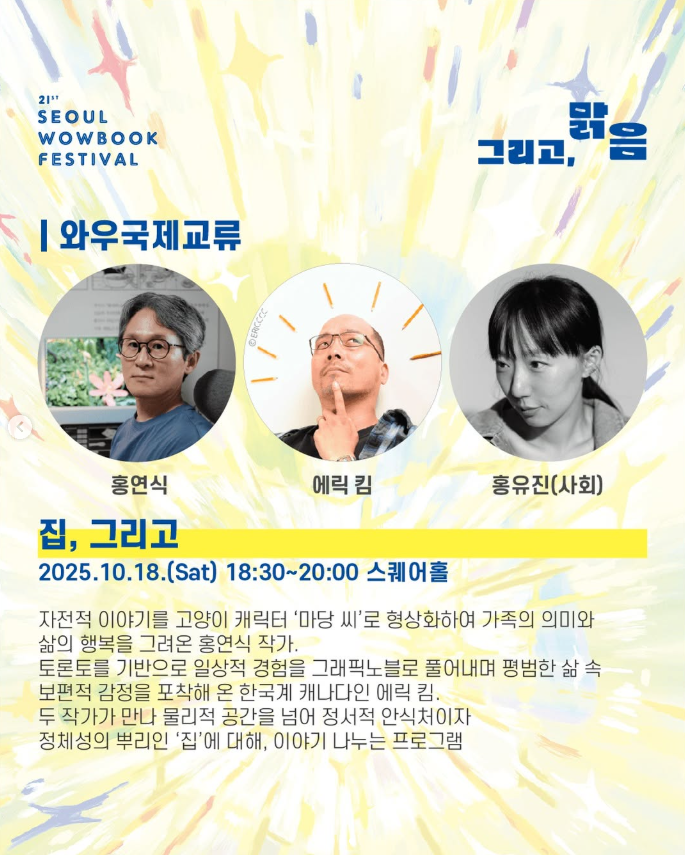 :: talks. I’ve been invited to two places this year: Seoul and Toronto! I’ll be speaking via Zoom at the 21st Seoul Wowbook Festival on October 18th, 2025, from 6:30-8pm at the Seoul Life Culture Center in Seogyo Square. I’ll be joining Yeon-sik Hong (Umma’s Table, Drawn & Quarterly) and Yu-jin Hong, where we’ll be discussing the subject of “Home.”