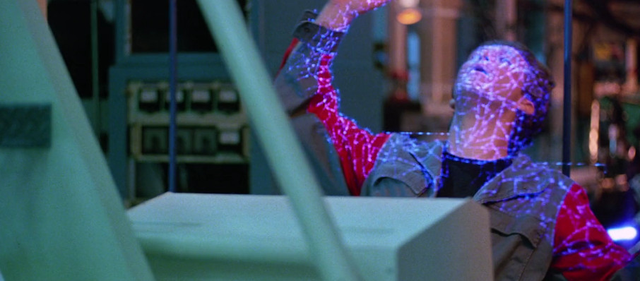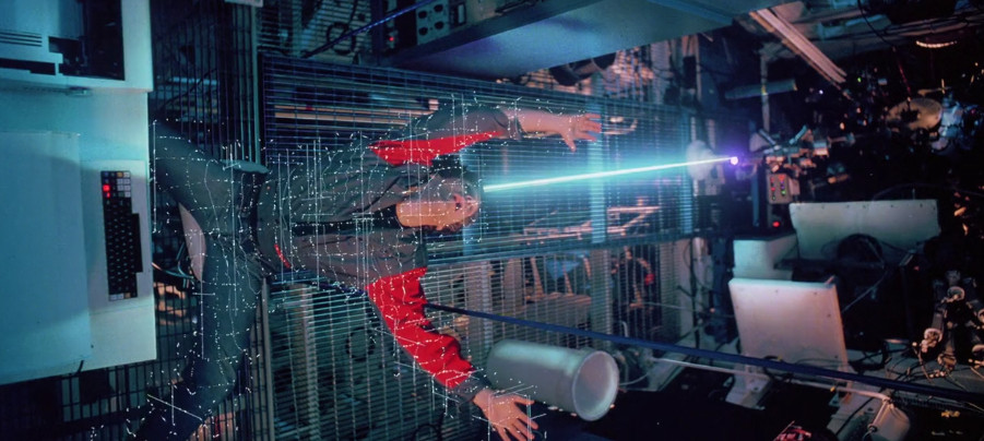 Another shot of the scene, capturing the complete meaning: the matter transporter laser shooting Flynn in the back, transporting him into bits and bytes