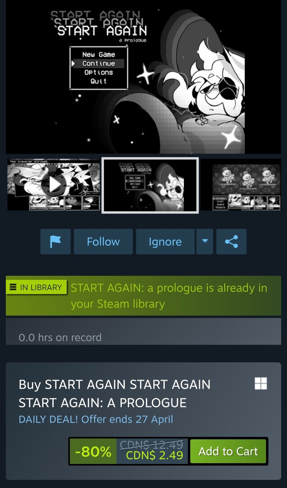 START AGAIN: a prologue is the first installment in the START AGAIN series, but this game is complete and you will not finish it feeling like you only read Chapter 1 of a 1000 page book! This prologue is more akin to a side story, a prototype for In Stars and Time, and stands completely on its own.