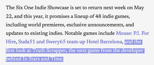 Also Truth Scrapper already been namedropped on a Game Informer article about the showcase. Next to Suda51. Mr No More Heroes. I didn’t scream (← lying)