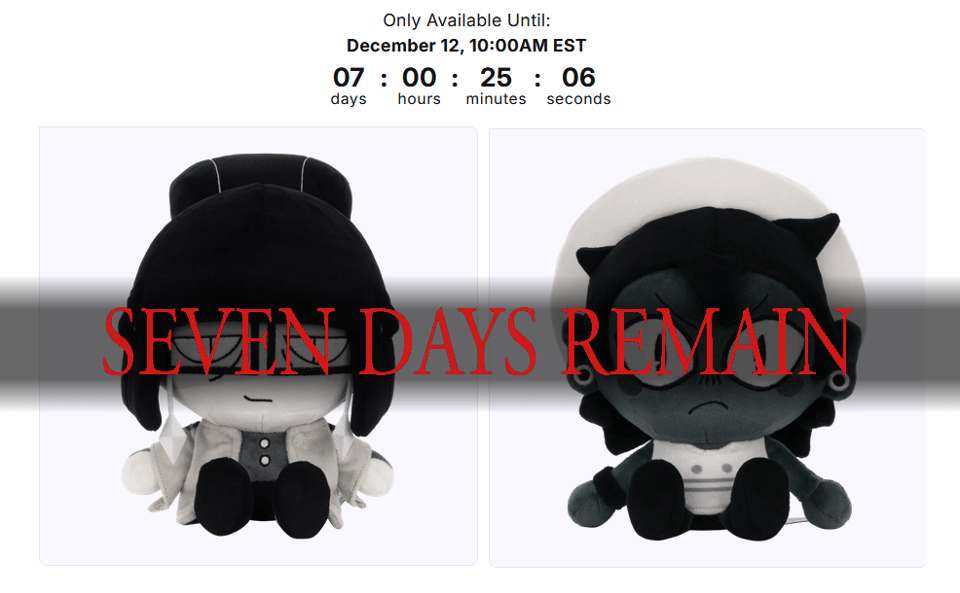 December 5, 2025 odile and bonnie plushies: 7 days remain: the remainering as per the title. siffrin is still here for a bit tho Don't miss what's next. Subscribe to insertdisc5's cute little mailing list: Subscribe Add a comment: Comment and Subscribe