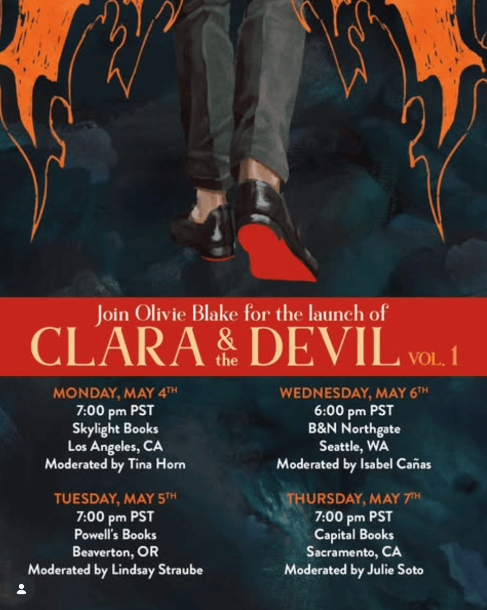 I am THRILLED to share that I will be hosting Olivie for her launch of her graphic novel CLARA & THE DEVIL at Barnes & Noble Northgate Station on May 6 at 6pm. If you saw us chaotically celebrate Olivie’s novel GIRL DINNER at Third Place Books last October and thought “my, those are two unhinged, under-slept, and deeply delightful creatures with great lipstick, I’d love to see them in (chaotic) conversation again," this is your chance!