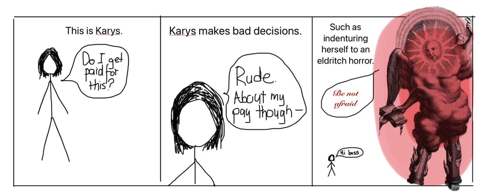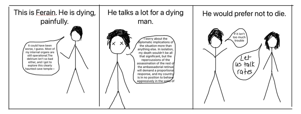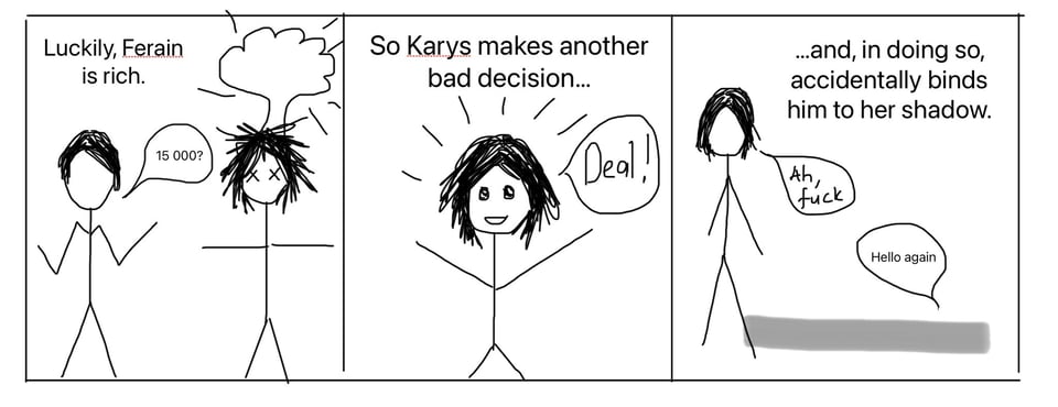 In this tweet, Kerstin helpfully illustrates (and I mean literally illustrates, with stick figures) how everything in Asunder just goes from bad to worse and worse and worse. Behold: