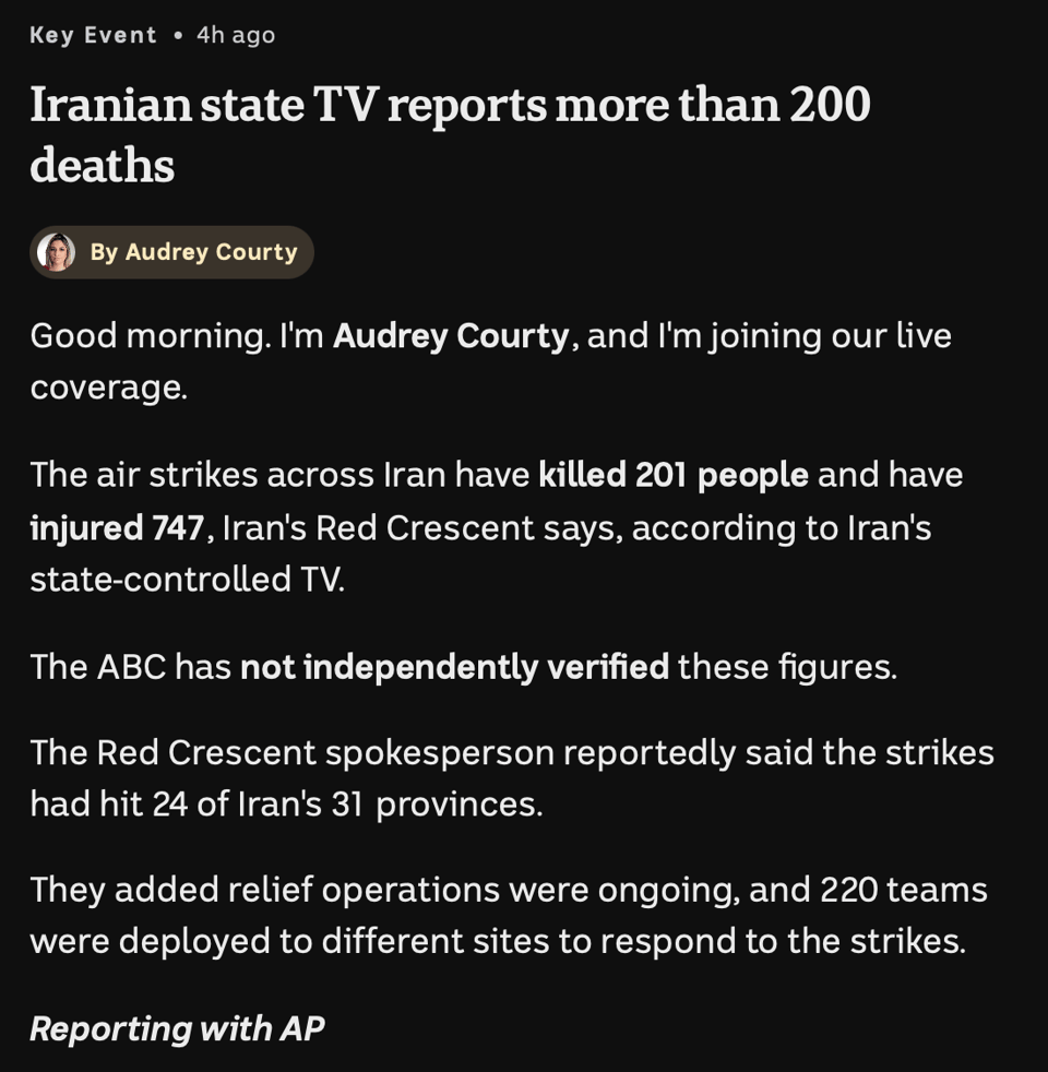 Notice that the “Red Crescent says” is followed by “according to Iran’s state-controlled TV,” which is then followed by: “The ABC has not independently verified these figures.” This is a clear editorial choice to cast aspersions, to put into doubt the reported deaths.