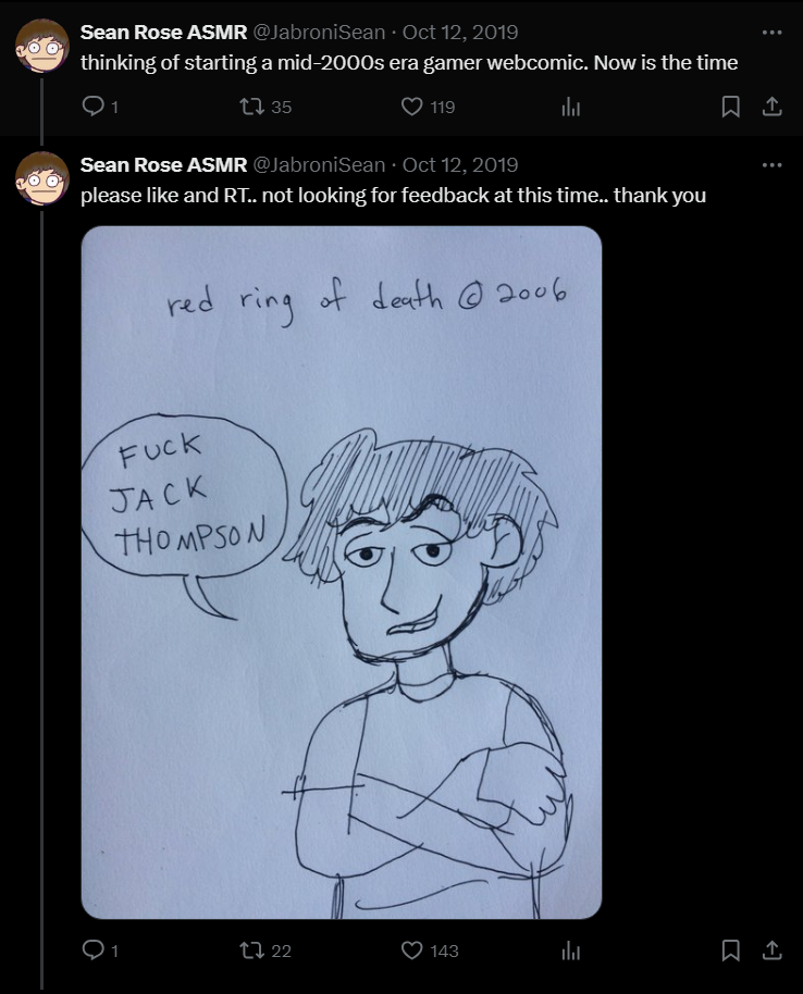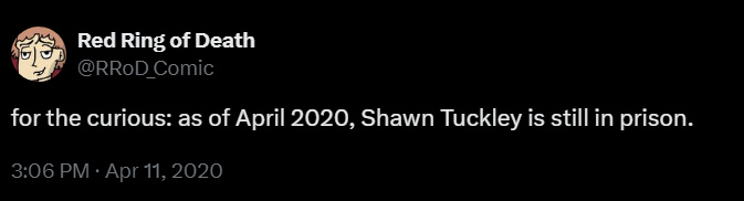 This is when the premise of Red Ring of Death truly clicked for me. Instead of just some gamer comic parody I was making for a dumb laugh, Red Ring became a real comic from the mid-2000s by a man named Shawn Tuckley. I was simply a big fan of his work, and after the comic was scrubbed from the internet following his arrest, I started the Twitter account unearth the Red Ring archives and preserve Shawn Tuckley’s artistic legacy.