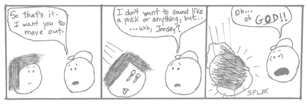 Of course, this kind of person isn’t entirely fictional. I’ve always had a fascination with comic creators who started making a simple gag comic, got famous from it, and then used it as an outlet for their bizarre crank proclivities. Scott Adams of Dilbert comes to mind. Dave Sim of Cerberus. That TERF weirdo who draws Sinfest. Writing for Shawn is fun because he’s a catch-all for every kind of crackpot bullshit under the sun. Childfree? Check. Anti-feminism? Sure. Anti-welfare? Why the hell not.