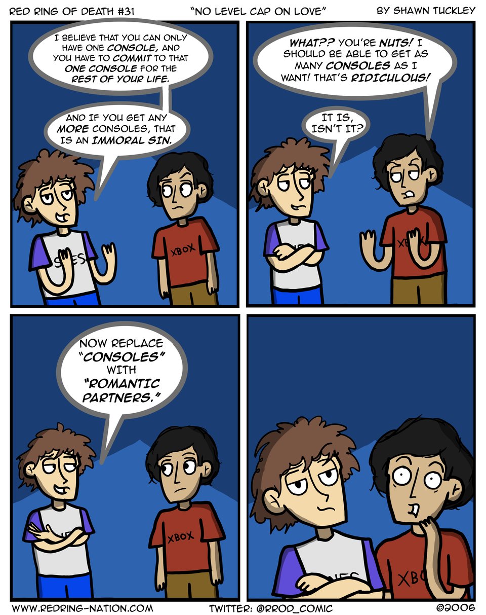 I came of age in the trashy internet culture of the mid-2000s, when comics about video games were the dominant webcomic genre of the time period. If you frequented any gaming forums or fan communities back then, you’d inevitably run into that one Penny Arcade strip about the XBox controllers being too big, or one if its many many imitators. Two poorly drawn dudes sitting on a couch, whining about some crappy game, being snide to their girlfriends and shooting John Romero in the head or something. Hard to fathom now, but this crude nonsense was synonymous with webcomics the same way superheroes were with print comics. What a weird time to be alive.