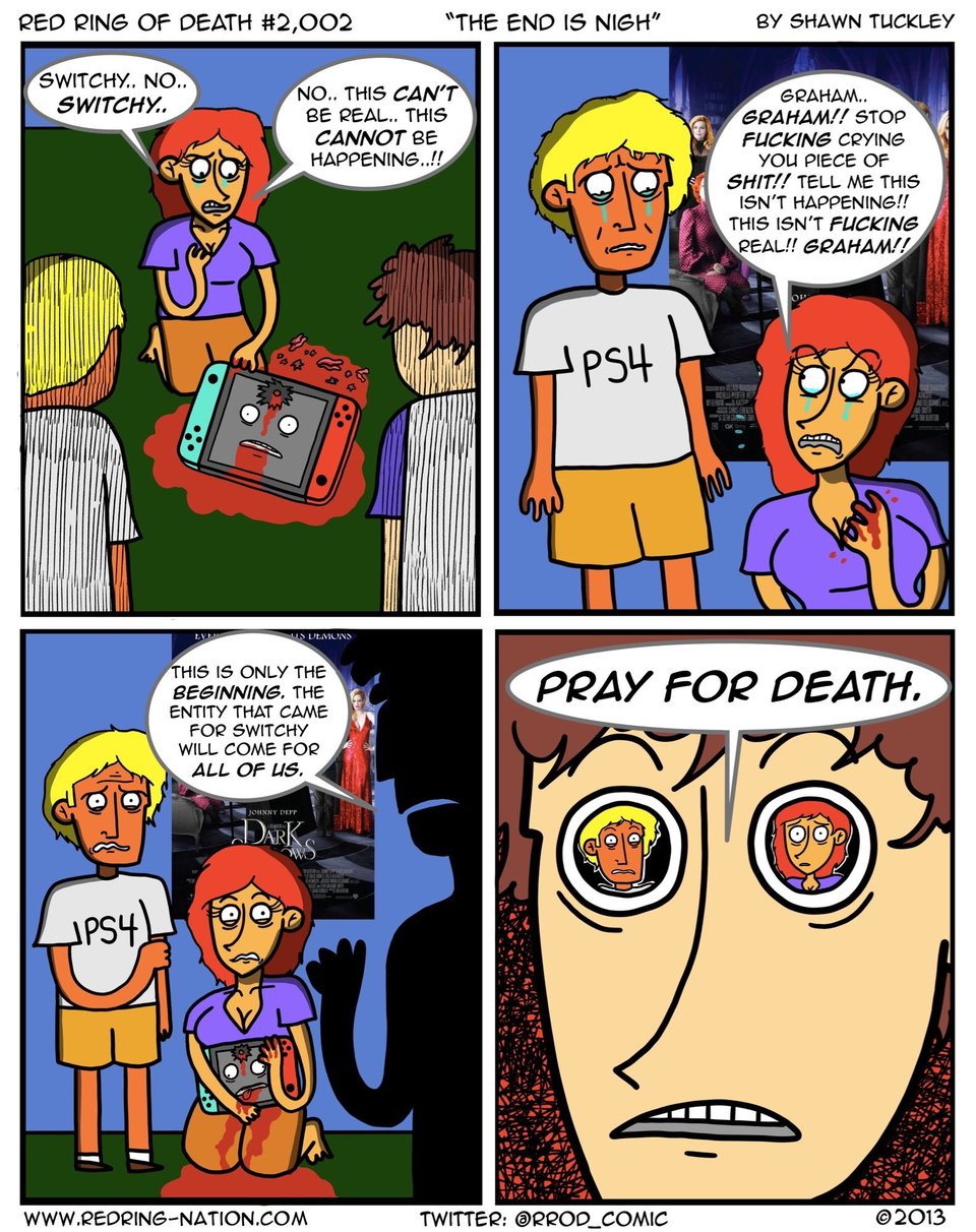 I’ve been having a lot of fun with the “Death of Red Ring” storyline I’m currently doing for Red Ring of Death. The gag is that Shawn Tuckley is trying to finally end the Red Ring strip in the most dramatic fire-and-brimstone way possible, killing off the entire main cast in a blaze of stupid violence. The comic’s been a monkey on his back for too many years, and now he gets to kill it off for good, to stomp out the horrible thing he created and move on to greener pastures. So I wanted to make the strips as resentful and hateful of the main cast as possible. It’s fun!