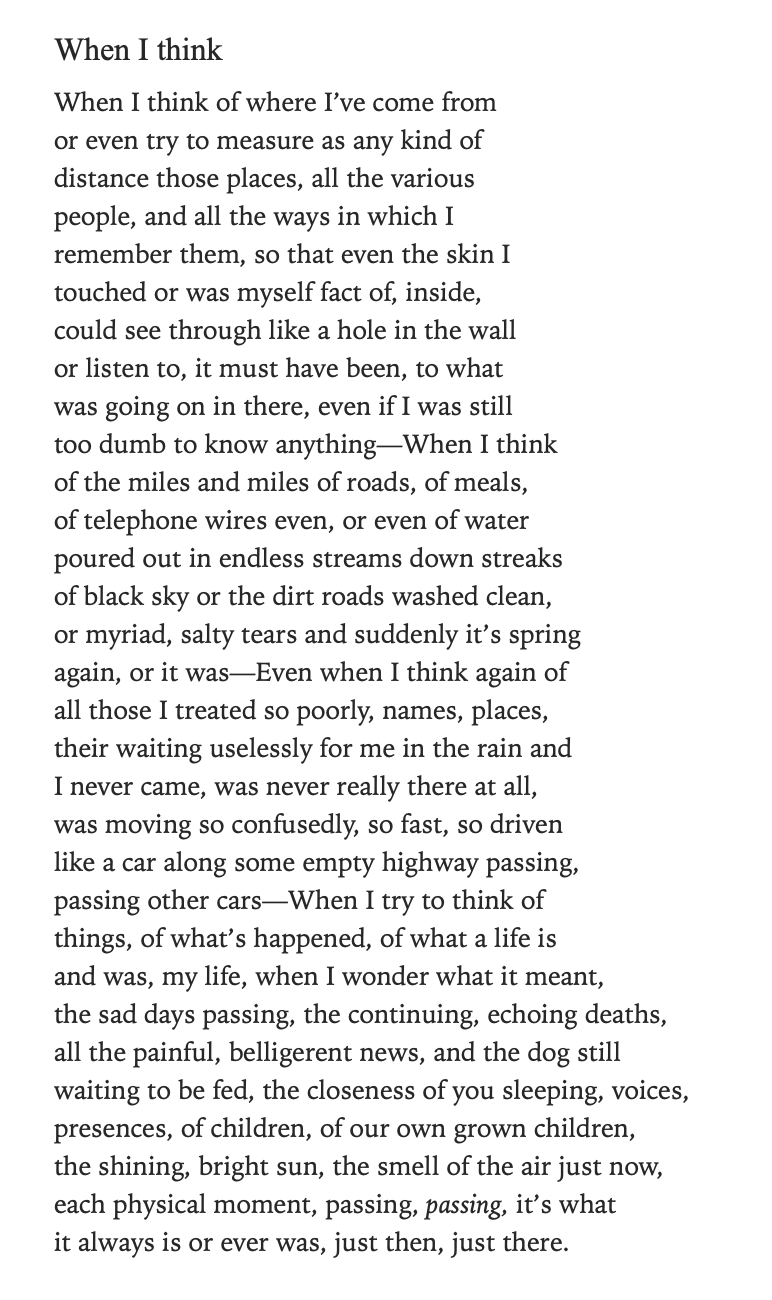 Then we might say that for a short while we had been our action and were free. Stevens again, “how high that highest candle lights the dark.” Then all at once we were life itself. Closer to the suffering heart of it. No preparing. But we meet, stop a little while, and can be together unprepared. I felt for a while, with my grandmother, a sense of the grace in an hour, to be together and not to know.
