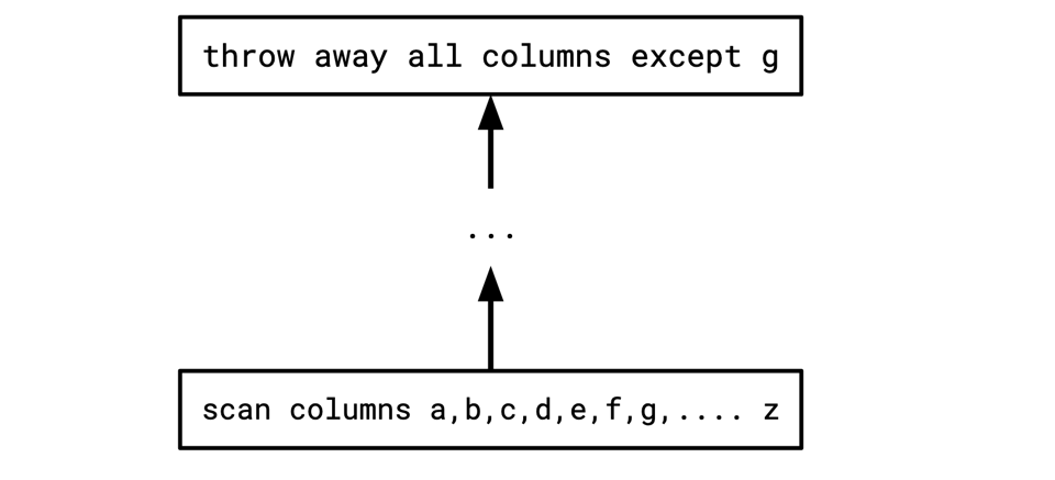 This kind of column pruning is desirable since it means we don't have to fetch the columns from the table, and we don't have to pass them along between every pair of operators, resulting in less data movement overall. In lots of planner architectures, I've found that this is actually a pretty annoying rewrite to do nicely. You often have to transmit information upwards operator-by-operator, and transmit information downwards via rewrites. This leads to some surprisingly complex code, and a lot of slow iterative rewrites of the tree.