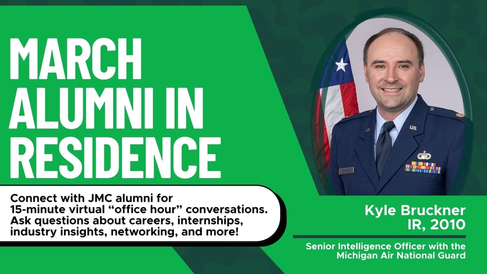 JMC students are invited to connect one-on-one with Madison’s March alumnus in residence, Kyle Bruckner (IR ‘10). Bruckner is a a Senior Intelligence Officer with the Michigan Air National Guard. The Alumni in Residence program offers students the opportunity to connect and network with graduates working in a variety of fields. Schedule a 15-minute Zoom meeting with Bruckner via Calendly to discuss life during and after JMC.