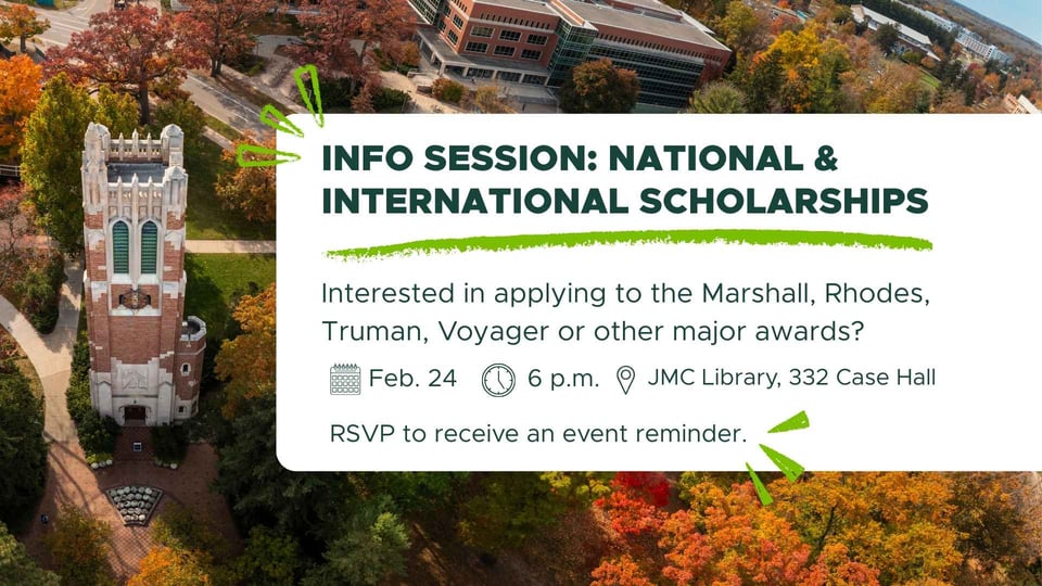 Feb. 24, 6 to 7:30 p.m. in the JMC Library (332 Case Hall). Hosted by Assistant Dean Jeff Judge, this session will introduce interested students to competitive scholarships and fellowships, including the Marshall, Rhodes, Truman, Voyager and other scholarships. Learn more via JMC (share your email via Qualtrics to receive an event reminder).
