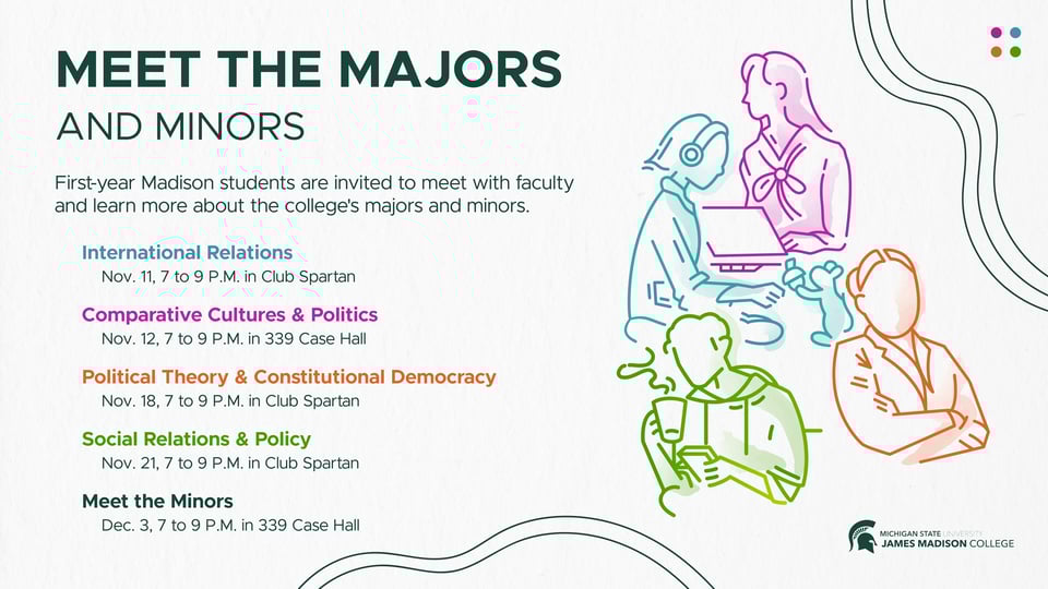 Dec. 3, 7 p.m. in 339 Case Hall. First-year Madison students are invited to learn more about JMC-affiliated minors (Political Economy, European Studies, STEPP and Muslim Studies) and other common minors that Madison students pursue. Students are strongly encouraged to attend all Meet the Majors events.