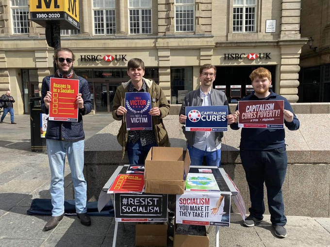 The young men in the photo above are who inspired the sketch. Now, given that photo was taken in Newcastle, I don’t expect these lads were there for much longer than the time it took to unfold their trestle table and pose for the camera. And yes, there are only four of them, and yes, they are from Turning Point UK, the Trumpian, Faragian, murkily funded right wing student organisation.
