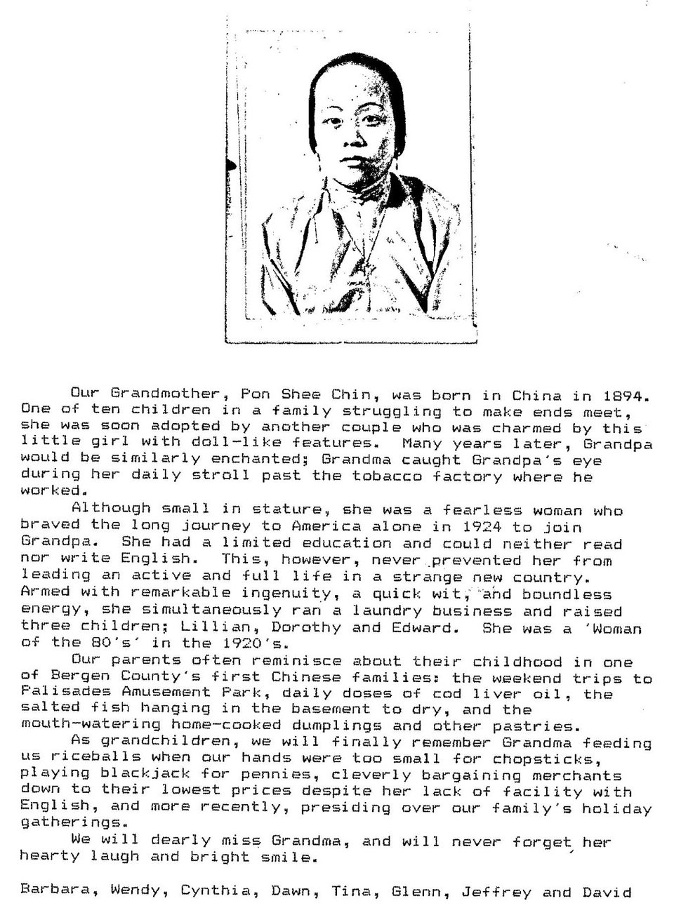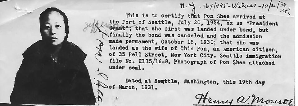 My momâs side of the family has been in the U.S. since the 1920s, when my great-grandmother, Pon Shee Chin, arrived from China, a 30-day journey via Seattle to join her husband (completely coincidentally named Pon Chin) in New York. My grandpa is the youngest of three children, born in Hackensack, New Jersey in the back of my great-grandparentsâ laundry, Chin Wing Laundry. He was born âEtwood Chin,â a story we all like to tell, because his mother could not pronounce âEdward.â The nurse wrote it down as she heard it.
