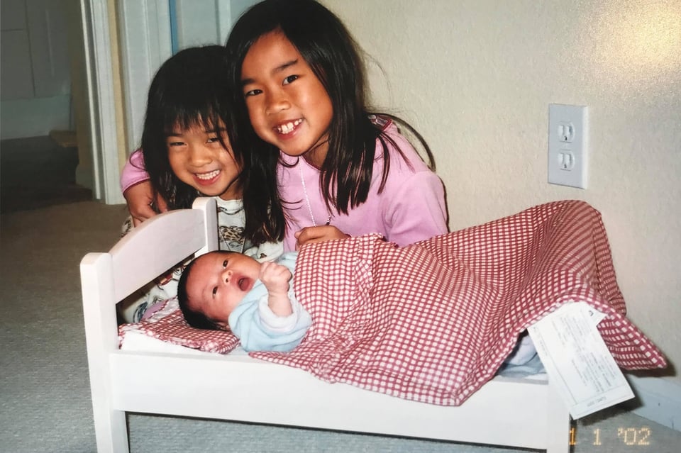 One of my most distinct memories is of being suddenly pulled out of the opening night of my second grade play, the âThree Piggy Opera,â in which I was supposed to play the triangle, and being called to the principalâs office. I was extremely nervous, until my teacher explained that I had to go to the hospital to visit my mom, because my youngest sister had just been born. Marisa, always resistant to change, was not as pleased to have a new baby in the family; in the hospital, when everyone was cooing over a newborn Kate, she loudly instructed everyone in the room, âQuiet! I canât hear the TV.â She later warmed up to the idea of having a younger sister, mostly because it was like having a living doll. One time when our mom asked us to watch Kate while she was in the shower, we put Kate in a little wooden dollâs bed. We found it hilarious. Our mom, not so much.