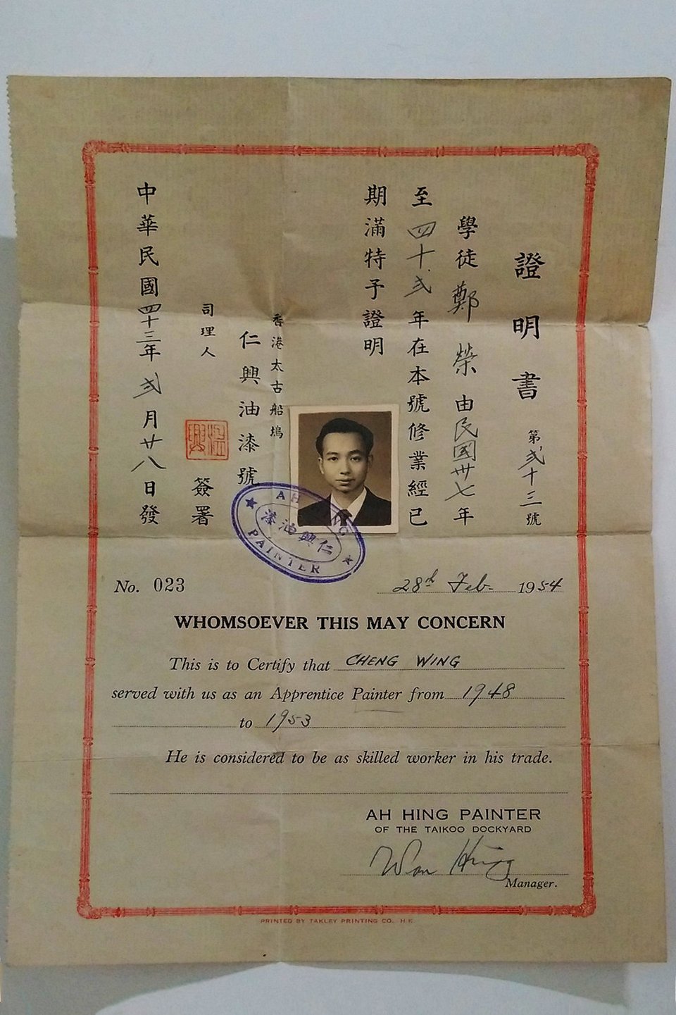 I just worked in the dockyard as a construction worker. I go to dockyard apply to job, I apprentice under five years. After five years I have experience, I find out to more better job. When I come here, I try to ask some people to hire me, to have job. They say, âI donât know your experience,â so I show them this [his work permit]. This under training five years. Same here. Otherwise, nobody hire you.