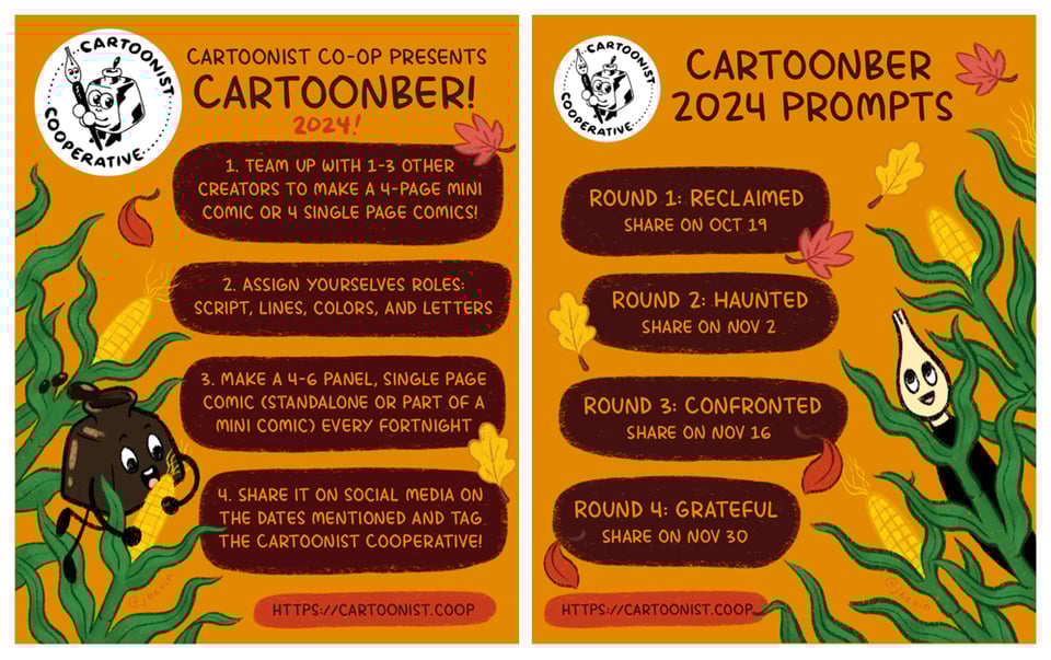 You still have plenty of time to join us for Cartoonber if you’re interested! You don’t have to be a Co-op member or have experience making comics to participate and have fun with us this fall 😄 Check out the graphics below and join us on social media!