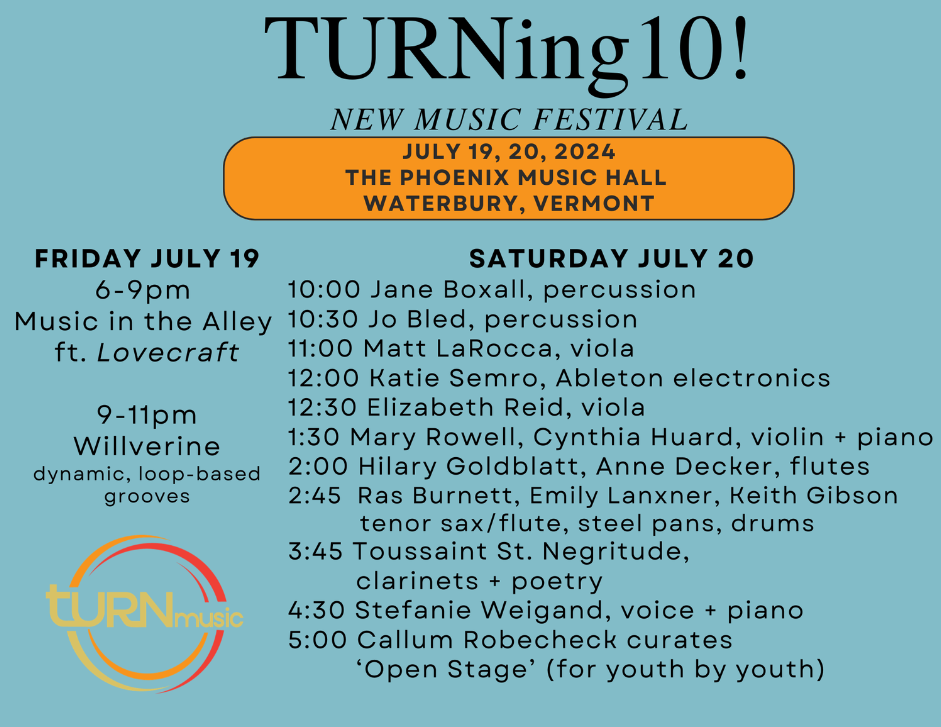 Show #1 (Saturday 7/20), TURNmusic’s “TURNing10 Festival” in Waterbury VT with many amazing musicians!