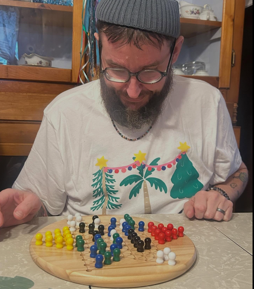 here is the most recent picture of me. i was really trying to beat my wife at chinese checkers. she won by 1 move. i am motivated by the fact that it was only my second game of cc as an adult.