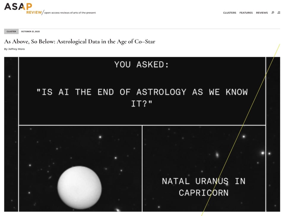 Ok back to the actually published stuff. My biggest project this year was co-editing a research cluster for ASAP/J, the journal of the Association for the Study of the Arts of the Present, with my colleages Tamara Kneese and Briana Vecchione, titled Algorithms and the Occult. Tamara and I had been daring each other for years to do something on this theme, so it’s especially fun to see it out in the world. All the essays are worth your time; mine is titled “As Above, So Below: Astrological Data in the Age of Co—Star.” Here’s a taste: