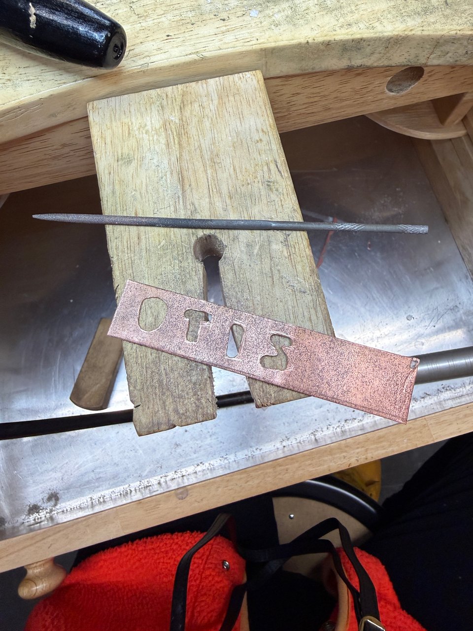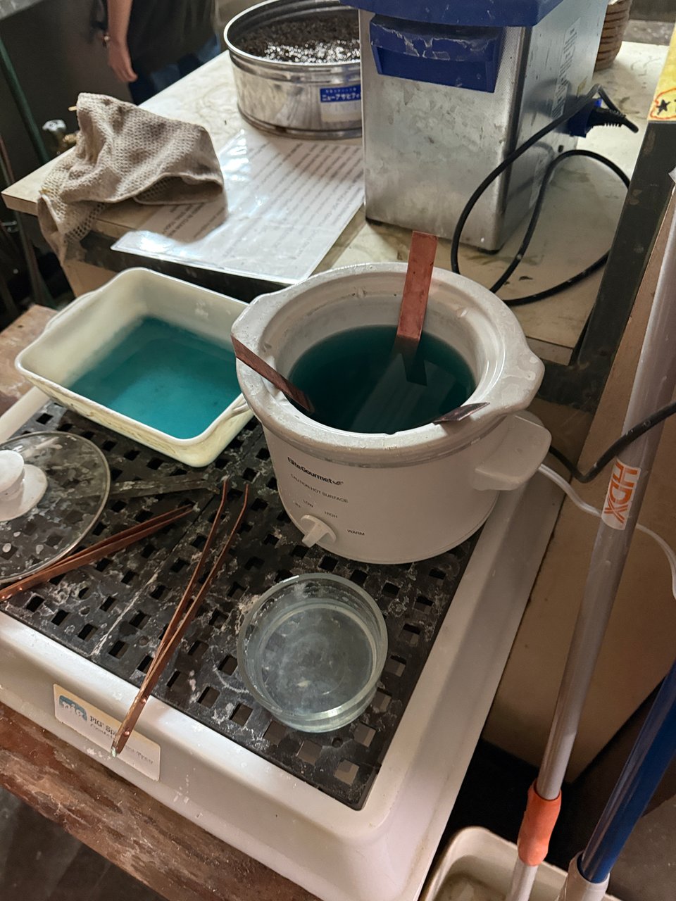 I learned about annealing. The process of heating up metal to make it more malleable. We're using copper right now and I got to LIGHT IT ON FIRE. So cool. And then you quench it - you literally throw it into water and it makes this crazy sound and is INSTANTLY cool to the touch. So neat. We mostly practiced what we needed to notice with the metals as we were lighting them, then noodled around with hammering stamps and such.