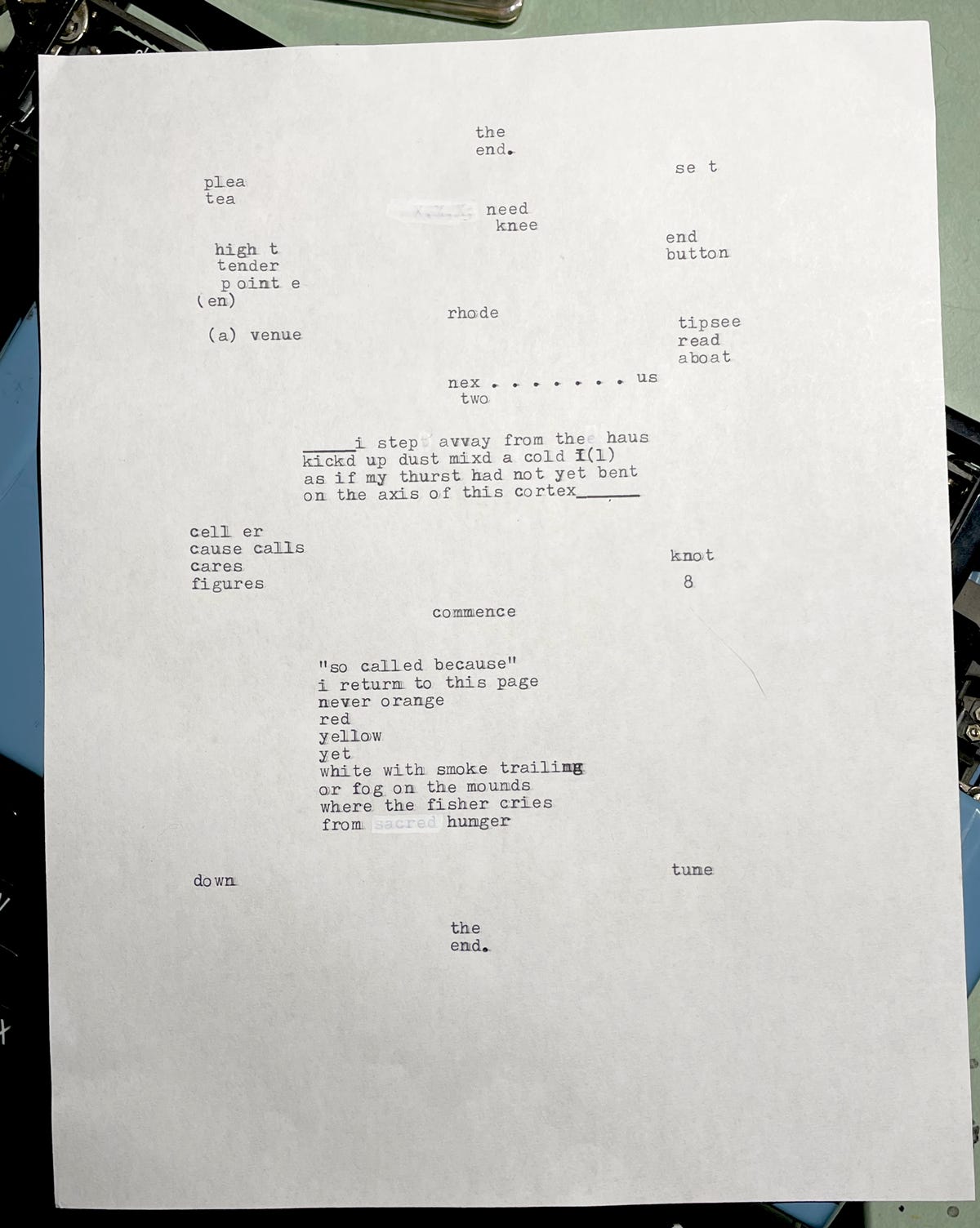 I begin improvising. I start at “the end” because why not get that out of the way and then work backwards? I hear the sound of a word, type it, see how it looks, which suggests another word. And so on. Soon, a trail of verbal and visual associations accumulates across the page. Private references occur to me. I allow them. I’m beginning to feel self-conscious, but this is play. Who cares? I keep going. I’m moving fast with language now. The gratifying clack/thunk of the key and type bar mechanism in motion creates a beat that I’m following. My conscious mind wants to pause, reread, revise, censor, simply stop. I keep the beat, finding words quickly like scraps gathered off the cutting room floor, and putting them down. I work the carriage return lever and carriage release lever in tandem, deftly shifting the paper position back and forth. Words are clustering, then shooting toward the margins. In a split second I wonder about a stanza, so I make one. Then, more words on the margins. The bottom of the page is near. I wind down. As it turns out, I end at the end.
