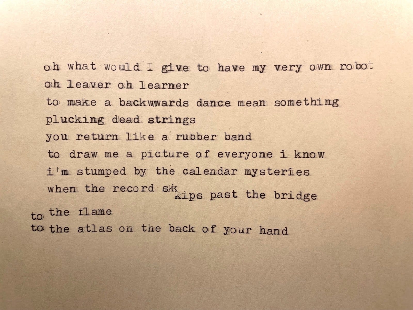 I’m living in language again. Writing these letters has helped me rediscover a love of language. It’s a practice. My tentative attempts at writing poems is also a part of this practice. In poetry, the language medium (for me) is much more rudimentary. Words – how they sound in my head or, less often, spoken aloud – are materials that I can manipulate, experiment with, collect from others, try on, shape, play with. The meaning of the words might arrive later as I consider how best to communicate something with someone.