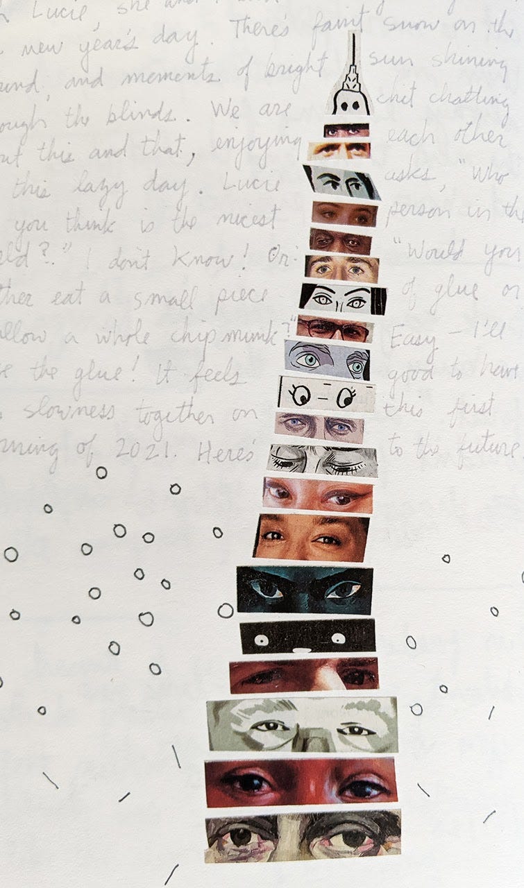 I dreamt the dream of the collapsing tower on new year’s eve, as we passed from whatever 2020 was into whatever 2021 will be. The morning after, I made a collage of cut eyes, although I don't believe I was consciously referencing the dream. A tilting tower of eyes, perhaps gazing back, or peering forward, but certainly looking at me in the present. This play of many eyes makes me think of that passage from the philosopher Walter Benjamin’s essay “On the Concept of History” in which he remarks on a painting by Paul Klee: