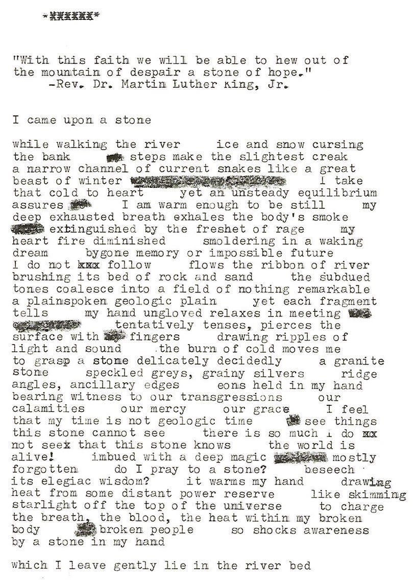 I’ve been working on a poem over the past week. As a new poem with only a handful of revisions behind it, I make no claims about its state of completion. Experimenting with different processes always leads to unexpected outcomes, though. In this case: first handwritten in pencil in my sketchbook (analog), then transcribed into the computer followed by a few rounds of revisions (digital), then typed out with the typewriter with some minor revisions (analog), then edited again by blacking out some clunkers (analog). It’s done enough and good enough to share.