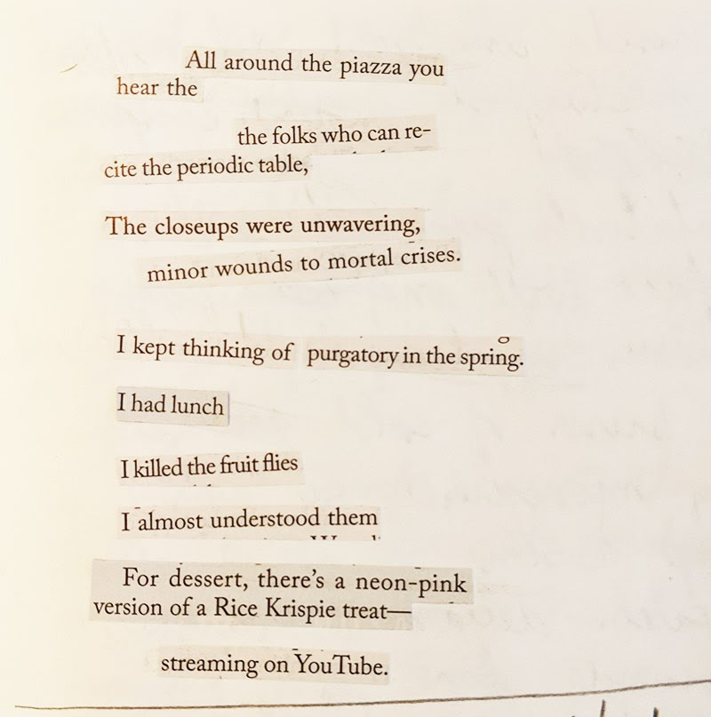 In my first letter to you, I shared a collage poem, and remarked on how interesting (and tedious) the process of creating these can be. Let me stress the tediousness: Imagine flipping through a stack of The New Yorker magazines, pages of mostly 10-point text with few photographs and illustrations to punctuate the browsing. (I subscribe, this is all the material I have readily available to work with right now.) My eyes dart across the pages, looking for something that grabs my attention; I don’t know what I’m looking for. I flip through the pages, back to front, then front to back, from one issue to the next, then repeat. Maybe if I were better at this, I would have a system, a method, a set of rules to organize my quest. After several minutes, I find it difficult to focus, and I start to lose patience. Eventually, I do find words and phrases that ignite some dormant ideas. With each fragment collected, exponential possibilities build. Images and words form a kind of static electricity. Hopefully, the glue stick is not the only substance holding the poem together. Ergo, “Purgatory in the Spring”: