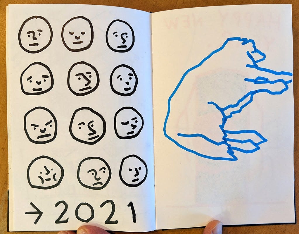 Lastly, the many faces of 2021. And it’s only January 29th. I’ve pulled many more faces since I drew this. Our border collie, Jasper, seems unfazed.